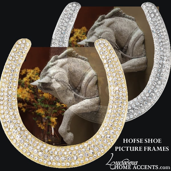 The Gold or Silver Horse Shoe Picture Frames from Luxurious Home Accents are encrusted with hand-set clear pavé European crystals embedded into a base of pewter.